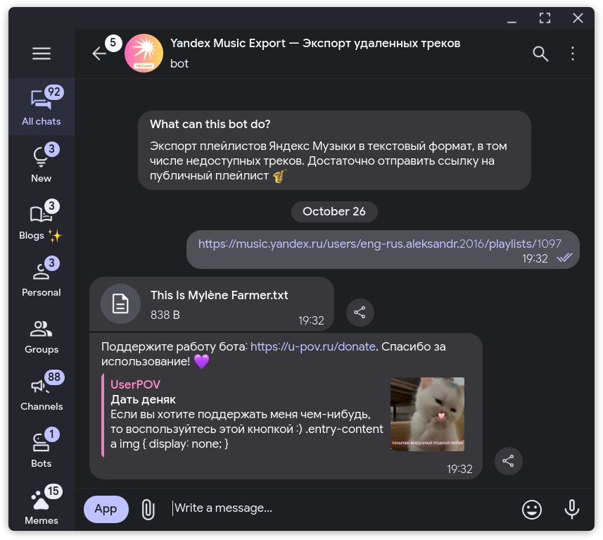 - Для экспорта плейлистов, в которых есть «удаленные» треки используйте телеграм-бота Yandex Music Export