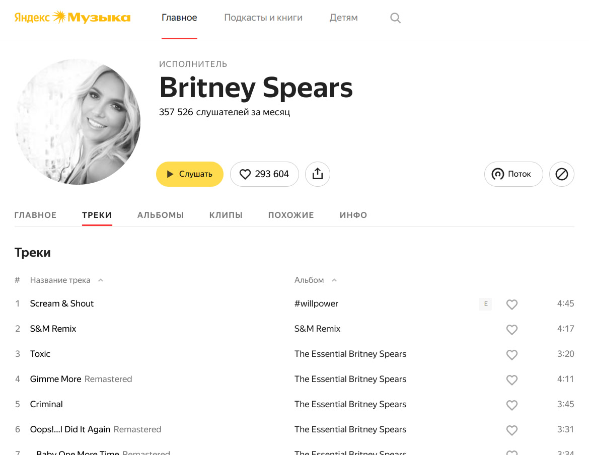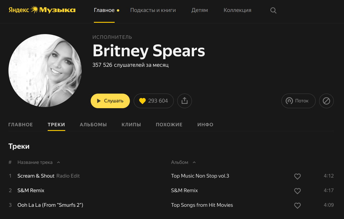В 2022 году из России ушли многие музыкальные лейблы и пользователи стали замечать, что у зарубежных исполнителей начали пропадать треки. Так, например, у Britney Spears сейчас доступно всего три трека 😄