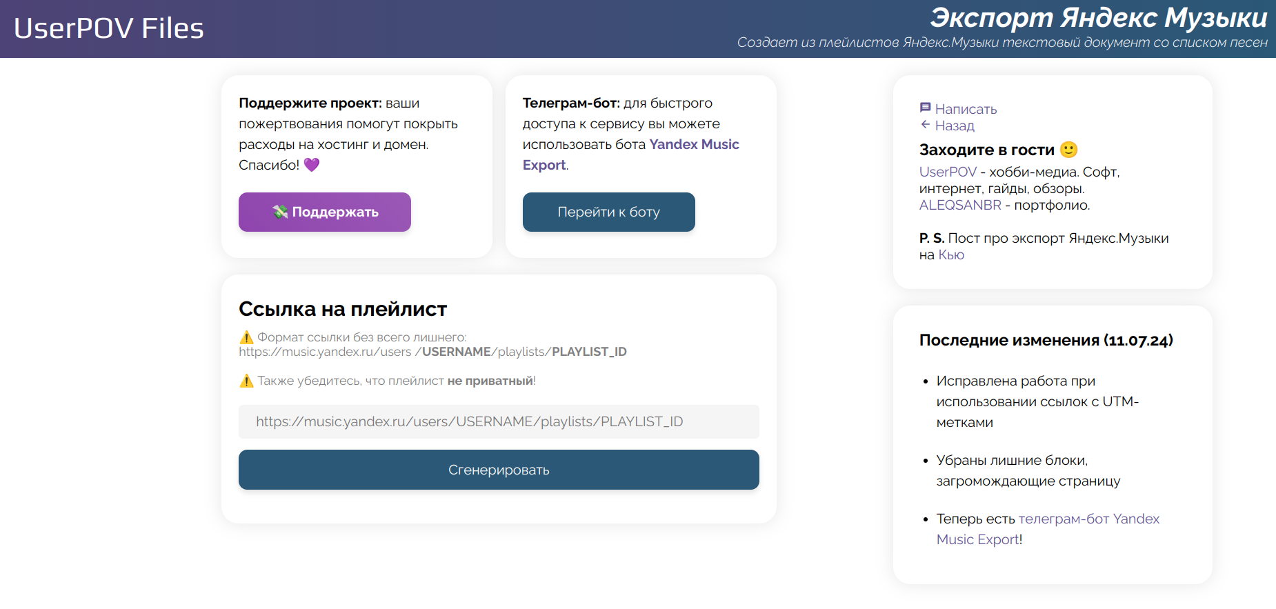 В прошлом, 2023 году я мигрировал в Spotify и для своего удобства сделал небольшой сервис по экспорту плейлистов в текстовые файлы. Впоследствии он стал достаточно популярным и по соответствующим запросам в поисковиках сервис можно наблюдать на первых страницах.